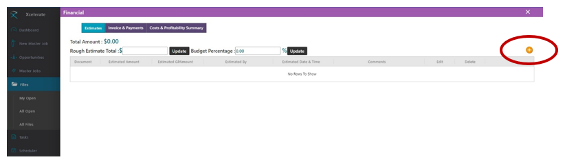 To add an estimate, you will need to navigate to the Financials tab in the file. From there you will select the orange Add icon.