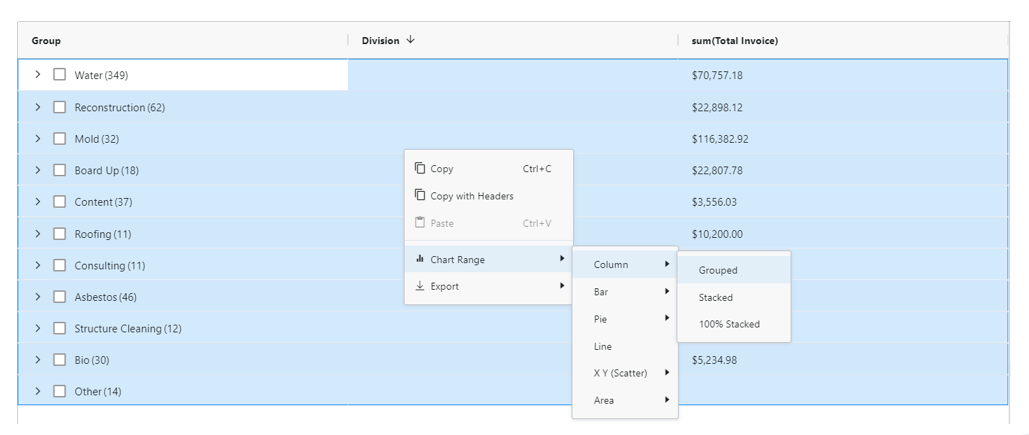 Click and drag Division to Row Group & Total Invoiced to Value to summarize the data accordingly.